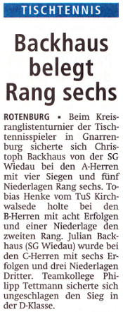 Christoph durfte bei der Herren A Konkurrenz aufspielen, in der einige starke Gegner gesetzt waren. Mit einer über weite Strecken klasse Leistung gelang ihm so z.B. der Sieg gegen Tim Müller, Top-Spieler vom Bezirksoberliga-Absteiger Bremervörde (Einzelbilanz von 18:14 im oberen Paarkreuz!). Gegen den späteren Sieger der Kreisrangliste, Arne Schlösser vom TuS Zeven (nächste Saison Ligakonkurrent der SG Wiedau), hatte Christoph dann allerdings mit 0:3 das Nachsehen. Insgesamt lässt sich ein guter 6. Platz aber durchaus sehen und stimmte auch Christoph, der gegen Ende des Turniers mit muskulären Problemen in der Spielhand zu kämpfen hatte, noch zufrieden.
