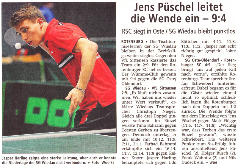 Diesen Freitag stand für unser Bezirksligateam um Mannschaftsführer Christoph schon das nächste Punktpiel gegen den VfL Sittensen auf dem Plan. Auch diesmal rechnete man sich keine großen Siegchancen aus, belegte Sittensen im letzten Jahr immerhin den dritten Tabellenplatz in der Bezirksliga und hat mit Routinier Torsten Gerken einen der besten Spieler der Liga in seinen Reihen. So gestaltete sich die Partie erwartungsgemäß recht einseitig zu Gunsten der Sittensener, die mit 9:2 gegen uns gewinnen konnten. Für uns punkten konnte lediglich Fahrad in der Mitte gegen Rainer Knoor (16:14, 11:7, 12:14, 11:8), sowie erneut Jasper, der gegen Udo Böttcher stark aufspiele (4:11, 11:8, 11:6, 11:2). Der letzte Tabellenplatz ist somit fest in Händen unser 1. Herren, die im nächsten Spiel gegen den Post SV Stade am kommenden Freitag schon mächtig unter Druck stehen.