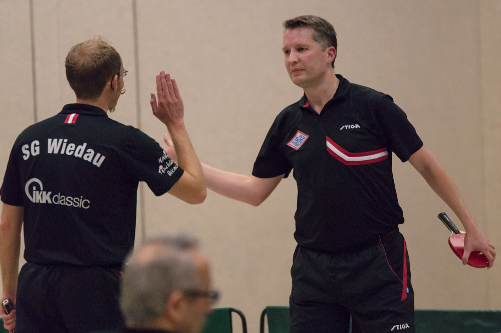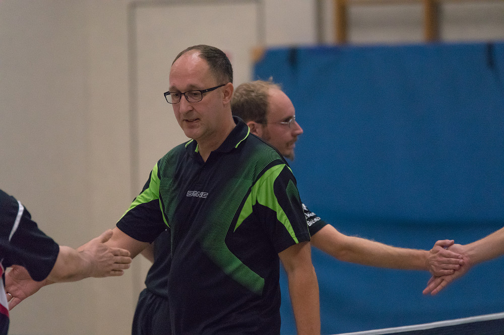 Es kam schließlich zum letzten Einzel des Abends, in dem Markus Funk in knappen fünf Sätzen die Oberhand gegen Marco behielt. So mussten wir bei einem Stand von 7:8 aus unserer Sicht im Enddoppel zumindest den einen Punkt zum Unentschieden retten. Unser Spitzendoppel um Christoph und Marco lösten diese Aufgabe aber letztlich sehr souverän und gewannen gegen Lange/Völkers mit 11:9, 11:7 und 11:1! Bravo!