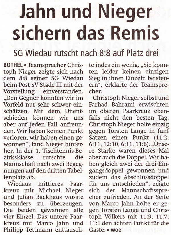 Unsere 1. Mannschaft fuhr gestern zum Auswärtsspiel nach Stade, möglichst, um weitere Punkte einzusammeln. Nach dem Auftaktsieg gegen Bargstedt war dies nun die zweite Partie der noch jungen Hinrunde. Stade jedoch war im Vorfeld ein Gegner, den man so gar nicht einschätzen konnte, waren doch viele für uns noch unbekannte Spieler dabei. Das Stader Team hatte im Vorfeld bisher auch erst ein Punktspiel bestritten, verlor dies jedoch knapp im Enddoppel gegen Bremervörde. Am Ende stand dann für uns am gestrigen Abend in einer umkämpften Partie ein verdientes 8:8 zu Buche, mit dem beide Teams gut leben konnten.