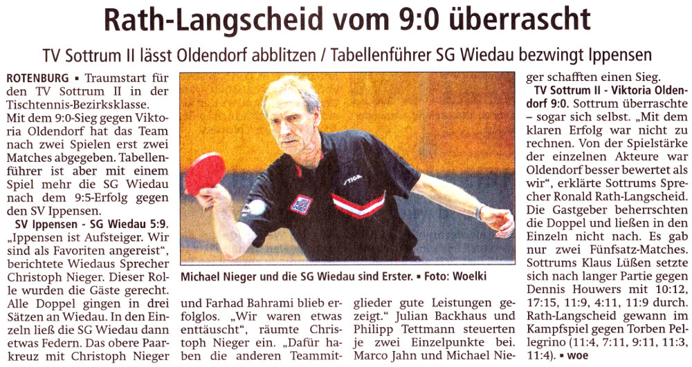 Diese Wiedauer Erfolgsserie wurde durch die kürzlich letzten Spiele im September eindrucksvoll abgerundet. Da war u.a. die Partie unserer 2. Mannschafts auswärts in Reeßum vom 25.09. Das Team um den leider verhinderten Mannschaftsführer Benjamin Rösler behielt in einem spannenden Auswärtsspiel am Ende mit 9:6 die Oberhand und steht durch diesem Erfolg momentan auf dem 2. Tabellenplatz hinter dem bisher noch ungeschlagenen Team aus Sittensen. Unsere Reserve hat nun aber erst mal einige Zeit spielfrei und greift erst am 25.10. wieder ins Spielgeschehen ein. Der Gegner ist dann an heimischen Tischen der TTV Nindorf.